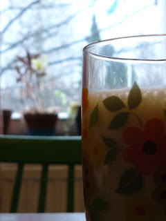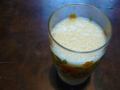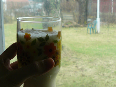 Tein, kuten Maijja muutama päivä sitten kehotti. Nam! Vähän sovelsin: köyhänä laitoin säilykeananasta tuoreen sijaan, kookoskerman ja -hiutaleiden sijaan kookosmaitoa, enkä jatkanut maidolla. En myöskään mennyt parvekkeelle, koska meillä ei moista ole, enkä suinkaan pihalle, koska siellä satoi. Laitoin vain puolikkaan banaanin ja tein kuvareportaasin. Meniköhän tämä sittenkään yhtään niin kuin hän kehotti?